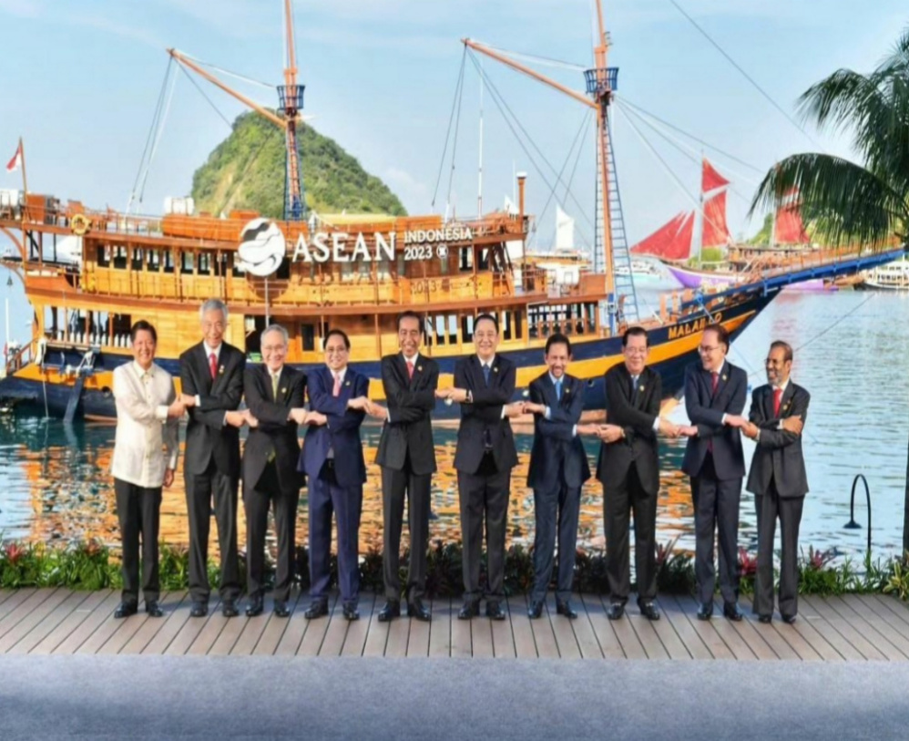 Para pemimpin ASEAN bergandengan tangan dengan latar belakang kapal Pinisi. Foto: instagram Jokowi